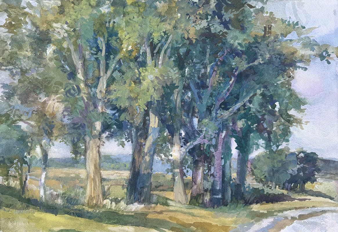 Soon trees will be budding out everywhere, following quickly with bright yellow-green leaves. As sunshine, rains, wind and temperature affect them, the leaves will change color. Mid-Summer Trees displays a quiet roadside with trees of a large range of greens, in shadow and in the sun. What a glorious sight they are. Impossible to give them justice, I have admired this cluster of trees for years and finally painted them.