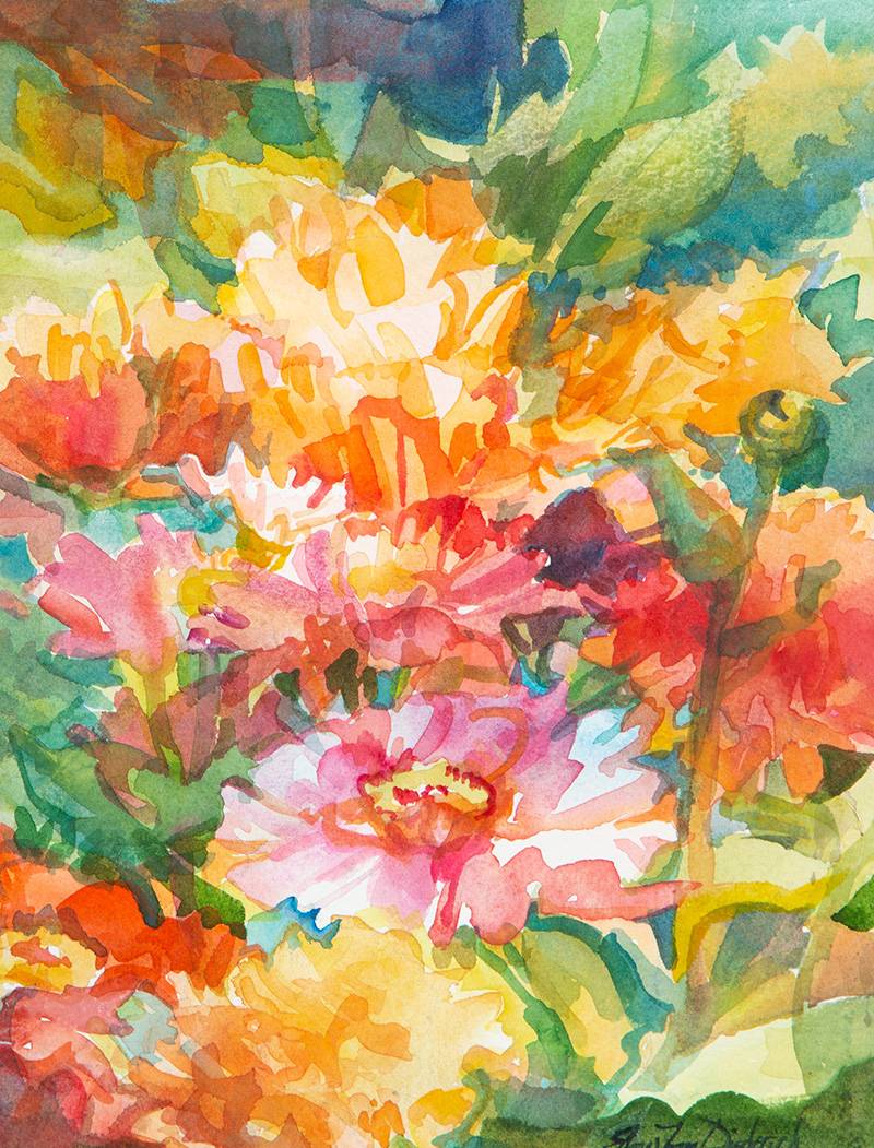 This summer I won a set of QoR watercolors from Golden Paints as a merchandise award for my painting Grand Entrance at the Red River Watercolor Society National Juried Watermedia Exhibition. I experimented with them on top of this painting. The color came alive thus the name “Electric Light Orchestra”! You are probably not used to seeing this much intensity in my work. Regarding color, intensity means the lightness or brightness of a color. Intense colors are usually pure pigments but can be mixed with a neighbor on the color wheel to change the hue. Wouldn’t this little gem of an original brighten up a room?