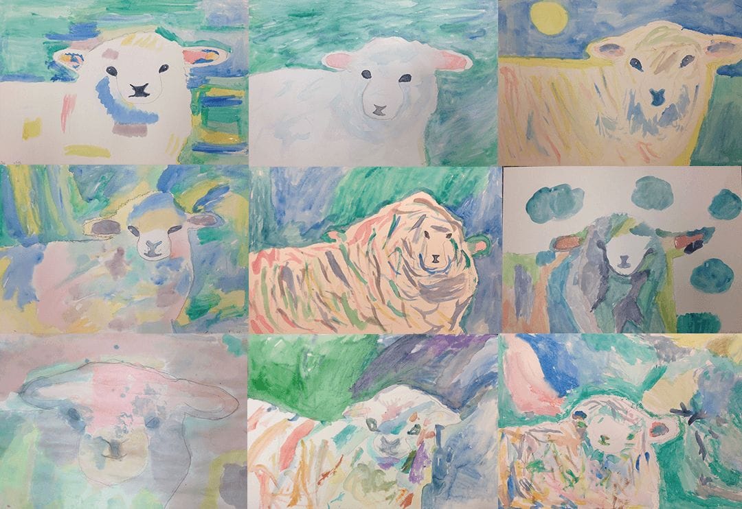In the art of watercolor painting it is necessary to allow drying time before adding details. Students will draw and paint the wool of Samson the sheep (the main character in “Samson’s Gift”). While the wool dries, Ellen reads her story to the students. Then they finish by adding the eyes and nose and background.