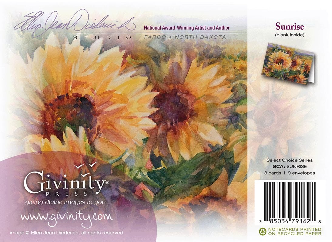 I wanted to try a different version of a sunflower field. What was different was adding the violet distant hills and the impressionistic glow from many flowers. Painting the sunflower petals through the distant violet hills is what made the painting. Now this is available as a notecard.