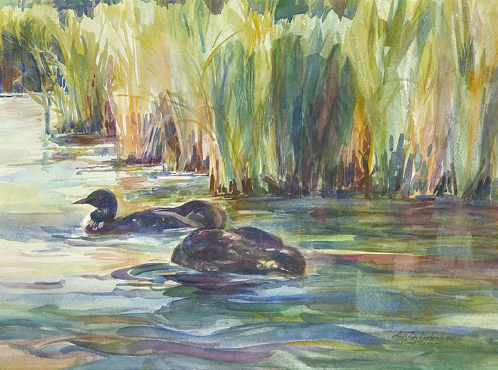 In “The Rustling Reeds” the loons are painted very simply. I learned so much about landscape when painting this piece when I fell in love with the upper left corner of the painting, and the orangey reeds. Playing consciously with the patterns of dark and light in the reeds and the edges changed everything. You need to see this original painting in person.