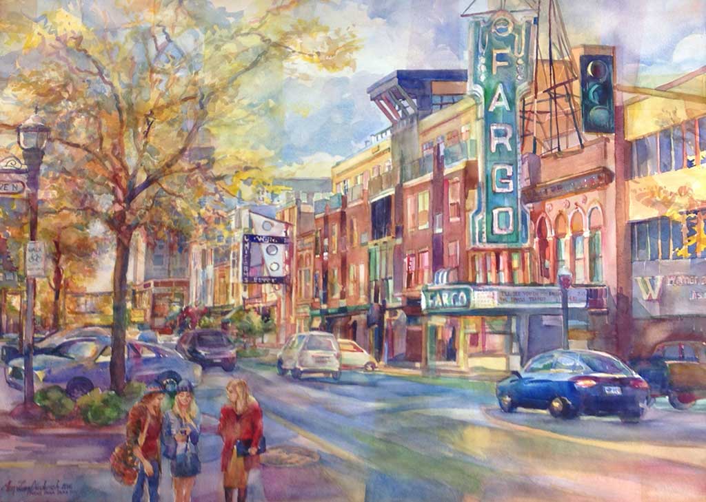 Remodeled Downtown Fargo, ND on Broadway Street with Millenials in the foreground of the historic Fargo Theatre.