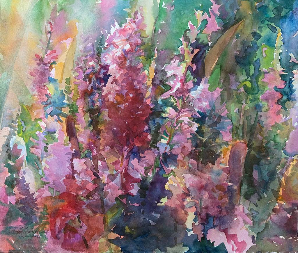 This beautiful reproduction includes wild flower and cattails. If vibrant color says Springtime!
