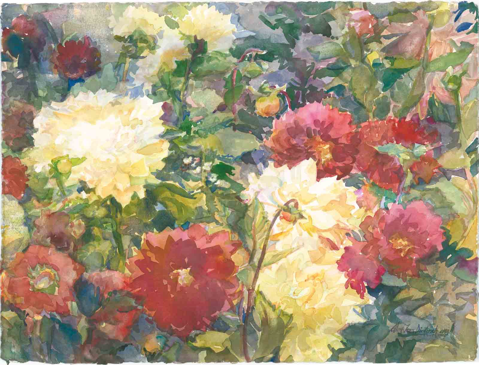 Notecards feature watercolor artwork of Yellow and Red Dahlias.