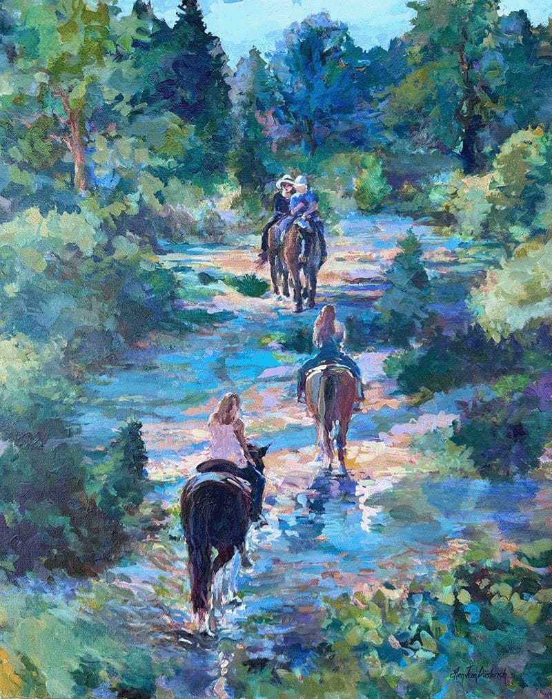 It was fun to design and paint Junction Point. This birds-eye view of the land was from Texas and the horses and riders were seen on some California hikes. The lighting from my landscape photo was beautiful and it worked to contrast the streaks of light with the dark horses. During the painting process, the big surprise was how the shadows in the sand from the front horses made them look like they just crossed a stream.