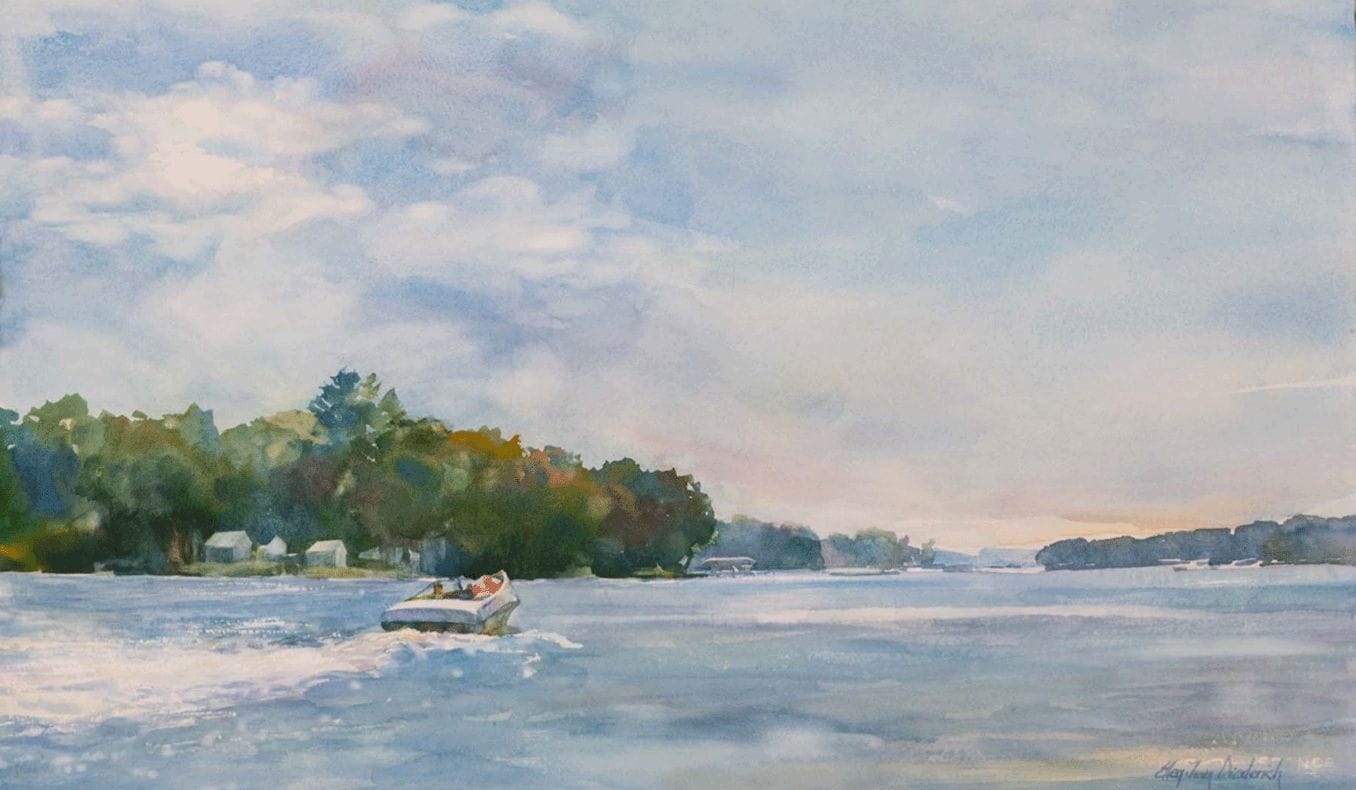 Here I wanted to paint the inlets on the lake and how in the distance accenting how the shoreline turns into a faded blue shape in the distance. Watercolor seems ideal for painting water and atmospheric space. Showing how colors appear cooler and lighter in value in the distance and warmer and darker in the foreground is called aerial perspective or atmospheric perspective.